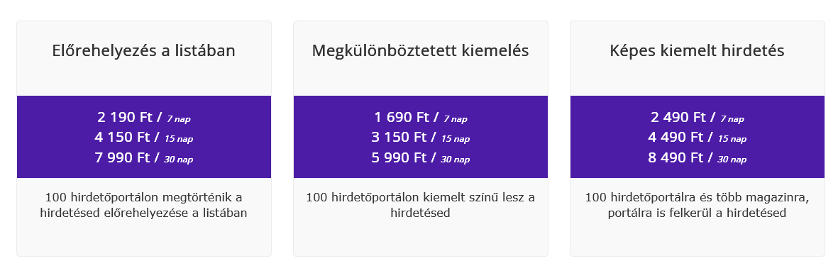 Hirdetési rendszerünkben az alábbi 3 típusú hirdetés kiemelés áll a hirdetők rendelkezésére:
